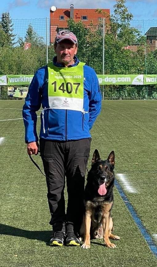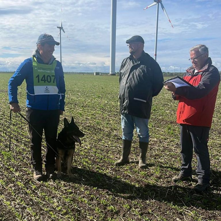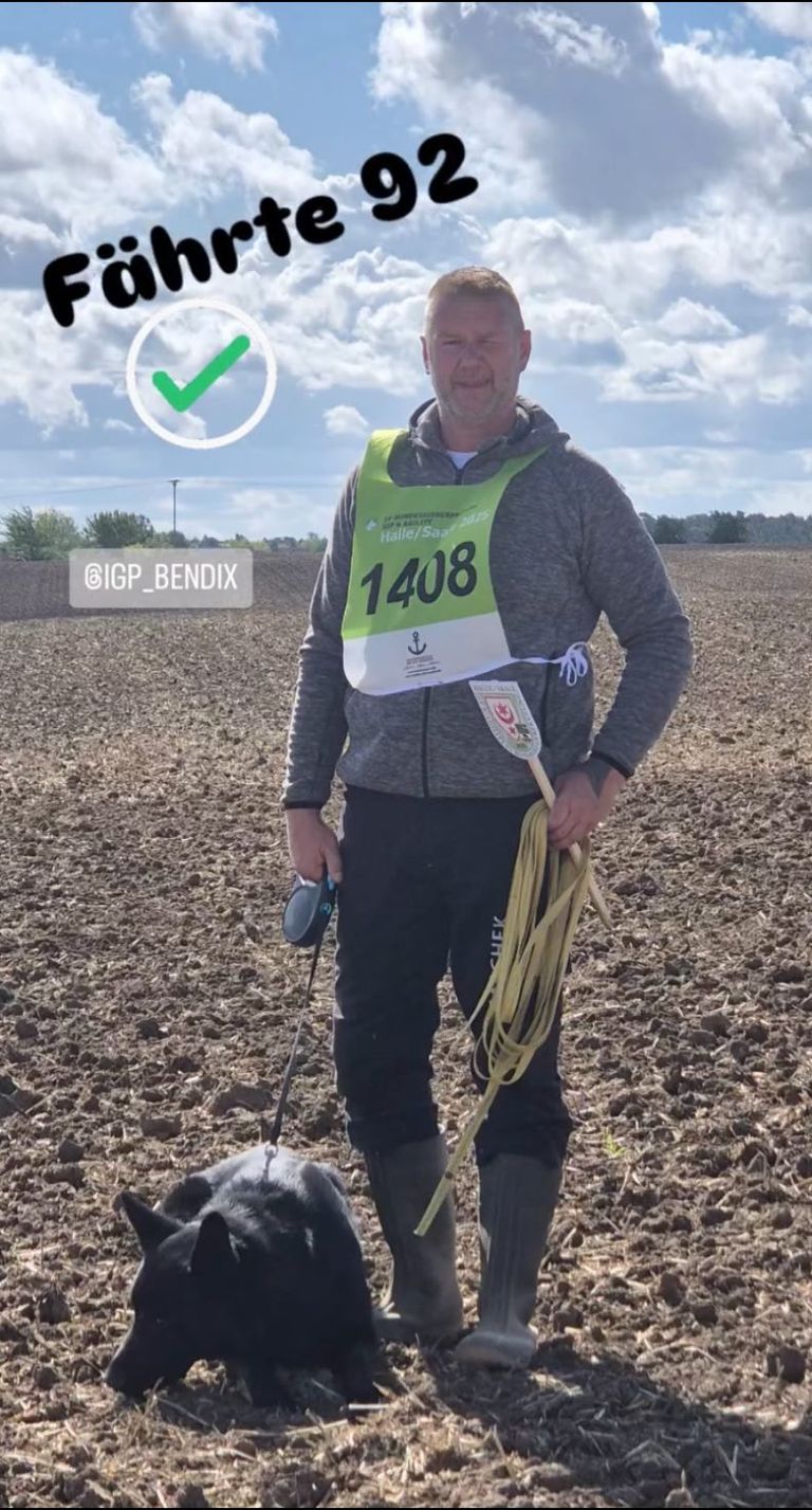 Bei strahlendem Sonnenschein konnte Eron von der Mohnwiese mit Thomas am Samstag hervorragende 99 Punkte erschnüffeln. Der Sonntagmorgen begann früh – aber das frühe Aufstehen hat sich gelohnt. Thomas konnte mit Eron in der Unterordnung fabelhafte 90 Punkte erzielen. Das Fachse-Team war aus dem Häuschen. Den krönenden Abschluss der Prüfung stellte der Schutzdienst der beiden dar. 96 Punkte TSB ausgeprägt – der zweite Platz auf dem 7 Länderwettkampf und somit wieder qualifiziert für die Bundessiegerprüfung in Verden. Ein phänomenales Ergebnis!