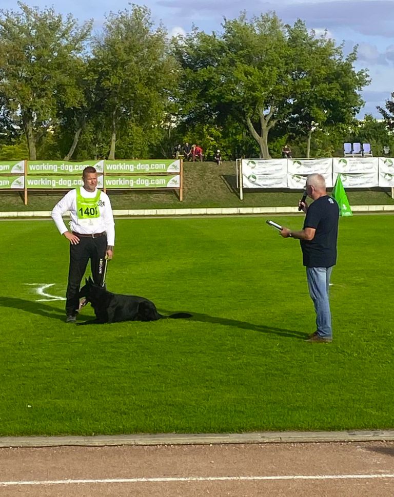 Für Trixi und Hunter war es die erste große Prüfung vor Publikum und die zweite IGP 3 Prüfung. Am Freitag kurz nach der Auslosung zeigten beide eine schöne Unterordnung mit ein paar Triebfehlern, welche beiden 85 einbrachten. Kurz darauf zeigte Hunter einen sehr guten Schutzdienst mit hoher Führigkeit was der Richter leider nicht so sah und somit für uns alle unverständliche 80 Punkte verteilte. Am Sonntag Morgen bei Wind zeigte Hunter dann eine intensive Fährte, welche mit 92 Punkten belohnt wurde. 257 Punkte und der 25. Platz können sich sehen lassen, für den ersten IGP geführten Hund von Trixi.